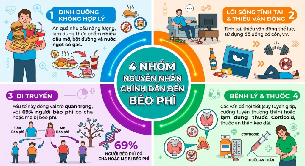 Có 4 nhóm nguyên nhân chính dẫn đến béo phì mà chúng ta cần lưu ý: