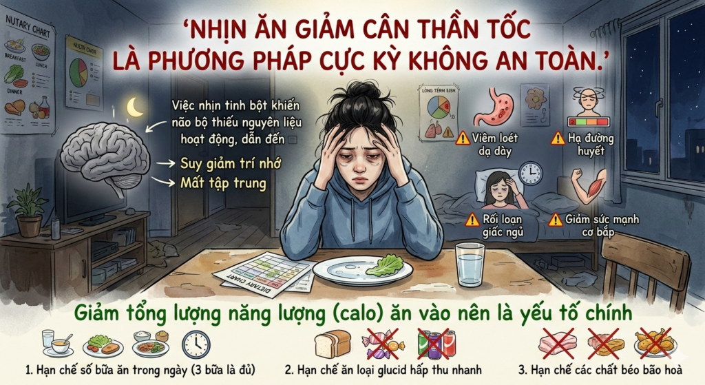 Bác sĩ Vũ Bảo Tú: Đây là phương pháp cực kỳ không an toàn. Việc nhịn tinh bột khiến não bộ thiếu nguyên liệu hoạt động, dẫn đến suy giảm trí nhớ, mất tập trung. Về lâu dài, nhịn ăn sẽ khiến cơ thể sẽ đối mặt với những tình trạng bệnh lý nguy hiểm như viêm loét dạ dày, hạ đường huyết, rối loạn giấc ngủ và giảm sức mạnh cơ bắp,… Giảm tổng lượng năng lượng (calo) ăn vào nên là yếu tố chính, bằng cách hạn chế số bữa ăn trong ngày (3 bữa là đủ), hạn chế ăn loại glucid hấp thu nhanh và các chất béo bão hoà.