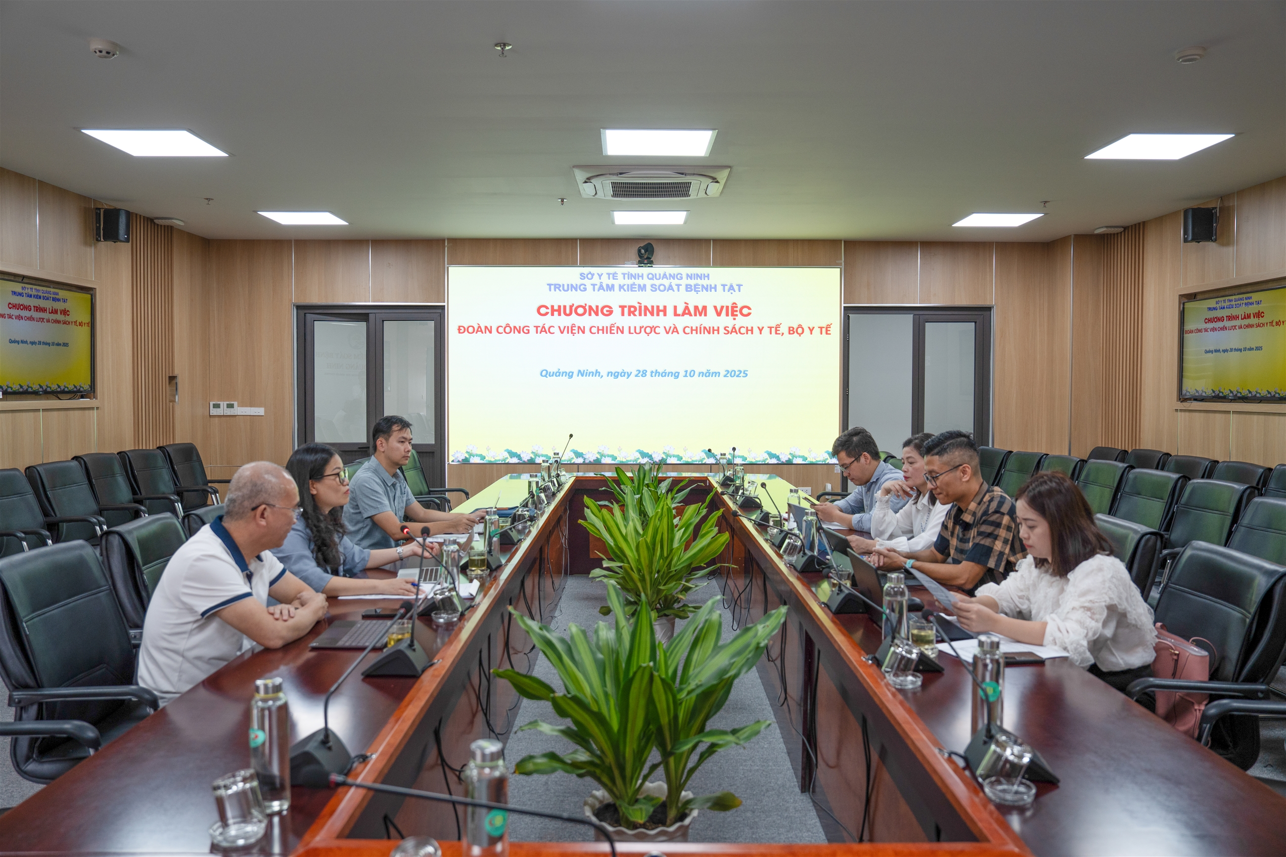 Tại buổi làm việc, đoàn công tác đã thảo luận với đại diện Sở Y tế, lãnh đạo và cán bộ phụ trách công tác y tế trường học/giáo dục thể chất của Sở Giáo dục Đào tạo, đồng thời nghe cán bộ Khoa Sức khỏe môi trường – Y tế trường học (CDC Quảng Ninh) báo cáo kết quả triển khai công tác y tế trường học trên địa bàn tỉnh. Bên cạnh đó, đoàn cũng tiến hành khảo sát thực tế tại một số cơ sở giáo dục công lập trên địa bàn như Trường Cao đẳng Y tế Quảng Ninh, Trường Tiểu học Bãi Cháy, Trường THPT Bãi Cháy,…