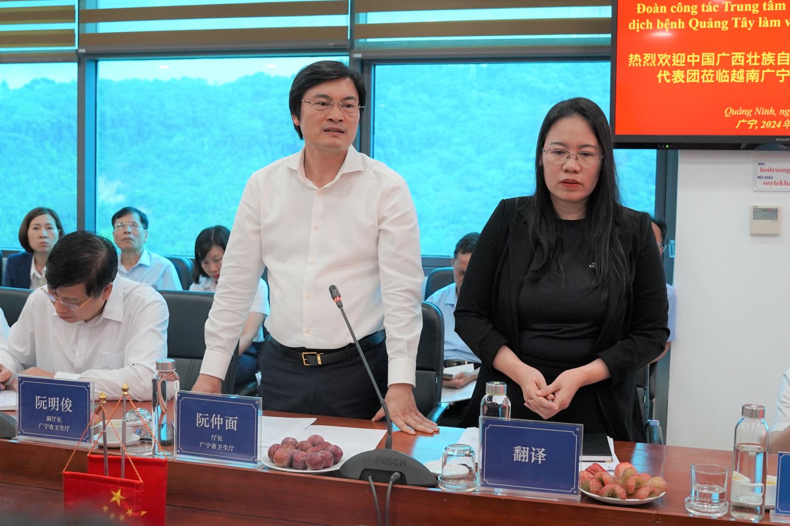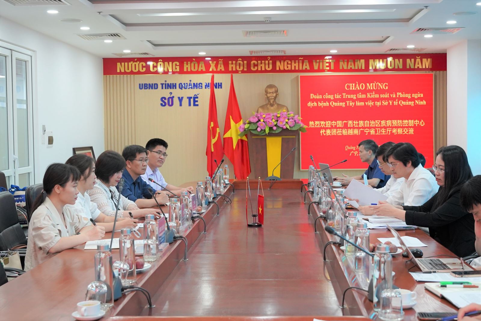 Phát biểu tại buổi làm việc, ông Nguyễn Trọng Diện, Giám đốc Sở Y tế tỉnh Quảng Ninh đã bày tỏ sự trân trọng tình cảm, tình hợp tác hữu nghị giữa ngành Y tế tỉnh và Trung tâm soát và phòng ngừa dịch bệnh Khu tự trị dân tộc Choang Quảng Tây thời gian qua; đồng thời đánh giá cao về sự phát triển của y tế Quảng Tây. Giám đốc Sở Y tế mong muốn trong tương lai sẽ có nhiều hoạt động giao lưu hợp tác, hiệu quả tích cực trong phát triển các phòng thí nghiệm, công tác phát hiện các tác nhân gây bệnh truyền nhiễm và xử lý các tác nhân tại khu vực biên giới. Và cũng mong muốn phía bạn sẽ có những hỗ trợ cho ngành Y tế Quảng Ninh kinh nghiệm về công tác quản lý các bệnh truyền nhiễm, đảm bảo biên giới hai nước an toàn - hợp tác - hữu nghị.
