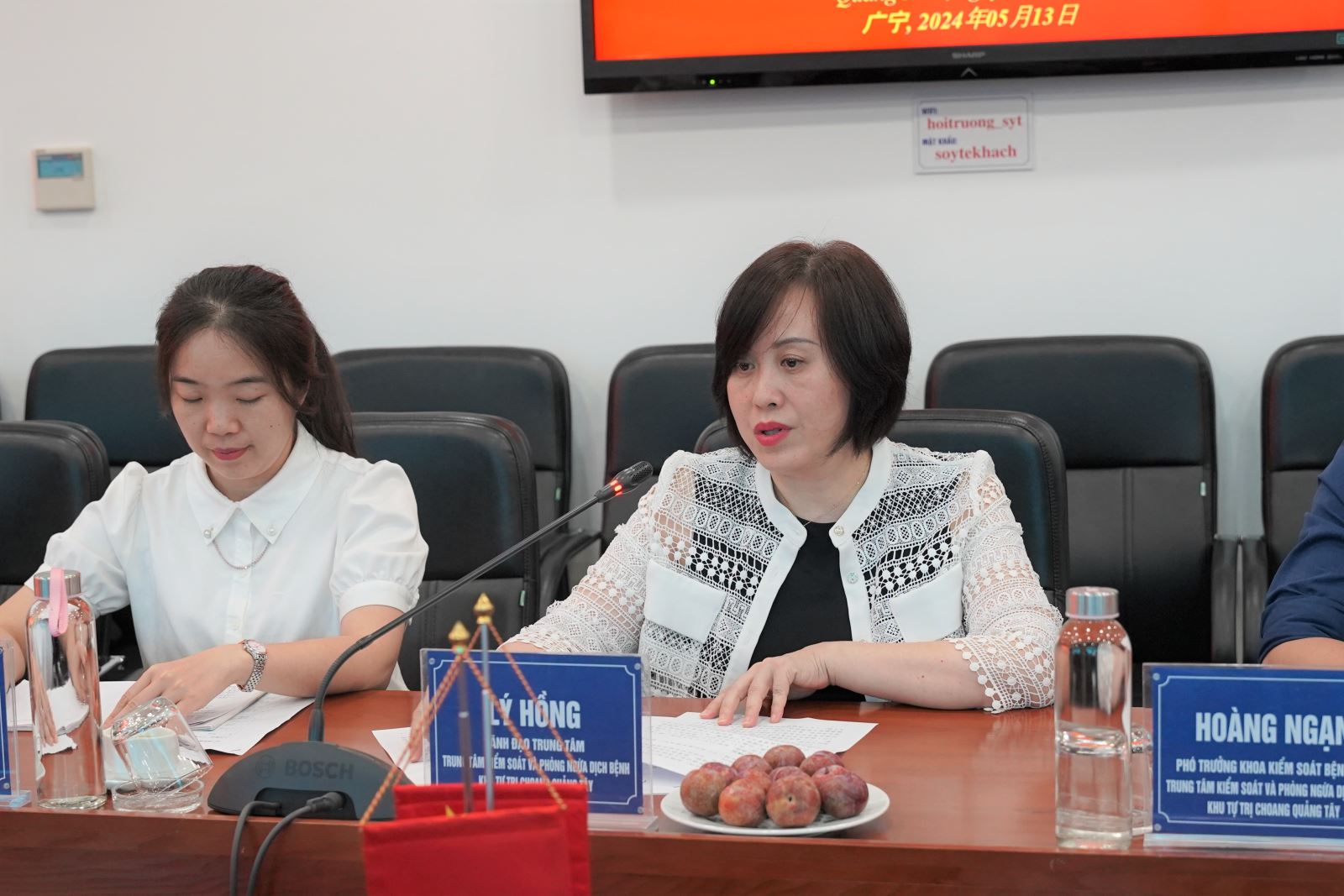 Bà Lý Hồng lãnh đạo Trung tâm soát và phòng ngừa dịch bệnh Khu tự trị dân tộc Choang Quảng Tây, trưởng đoàn công tác báo cáo tại buổi làm việc