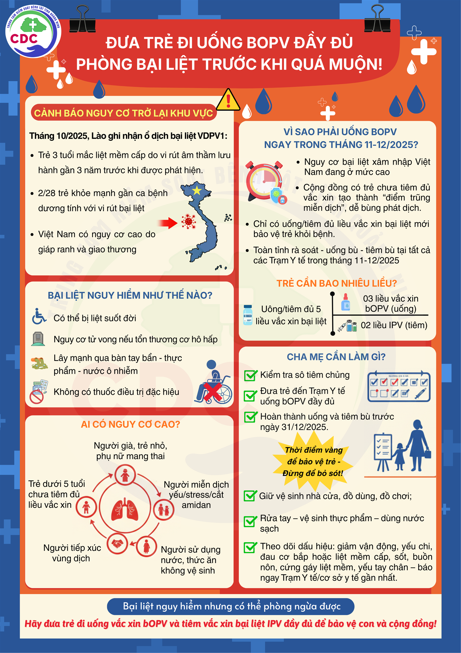 “Bại liệt nguy hiểm nhưng có thể phòng được. Hãy đưa trẻ đi uống vắc xin bOPV và tiêm vắc xin bại liệt IPV đầy đủ ngay trong tháng 11–12/2025 để bảo vệ con và cộng đồng!”