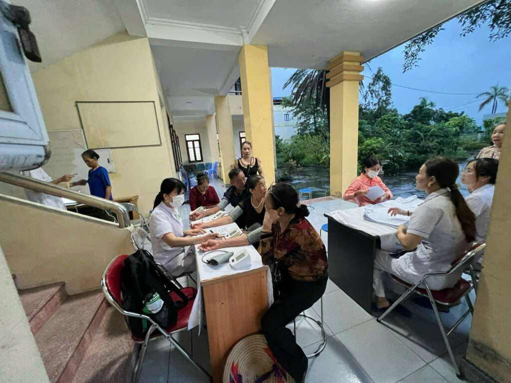 Tại điểm khám là Trạm Y tế xã, không khí đã bắt đầu nhộn nhịp từ sớm. Các cán bộ y tế chia nhau mỗi người một việc: người hướng dẫn ghi phiếu, người đo huyết áp, người lấy máu xét nghiệm, người tư vấn dinh dưỡng.