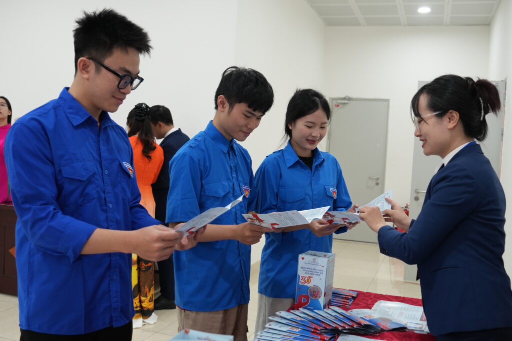 Cán bộ khoa phòng, chống HIV/AIDS (CDC Quảng Ninh) phát tài liệu tuyên truyền cho thanh niên trường Cao đẳng Y tế Quảng Ninh